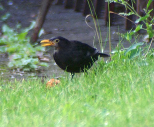 Part of next door’s apple tree overhangs the hedge; the tree is laden with rosy apples and many of the smaller fruit have begun to drop to the ground. The windfalls have been providing a regular treat for the Blackbirds.