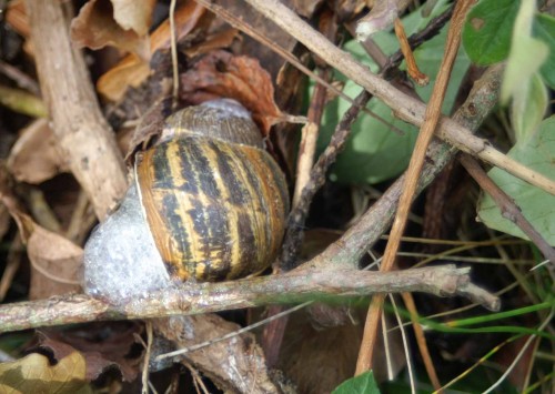 I found a garden snail close by the spot the moth flew out from. There is nothing it can do much damage to in that particular area, so I replaced it under the hedge, where to my surprise it began producing a mass of foamy bubbles. I’ve been trying to discover why it would have been doing that but haven’t come across an explanation I’m happy with yet.