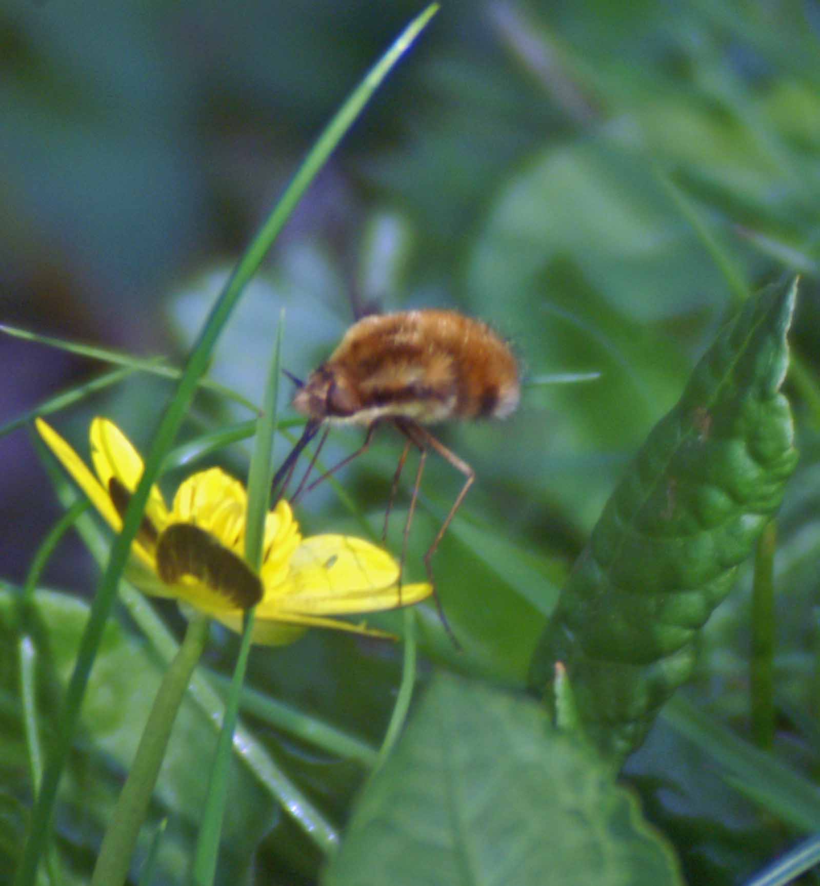 A favourite insect of mine, the bee-fly has a permanently projected long proboscis and ridiculously long legs to balance it
