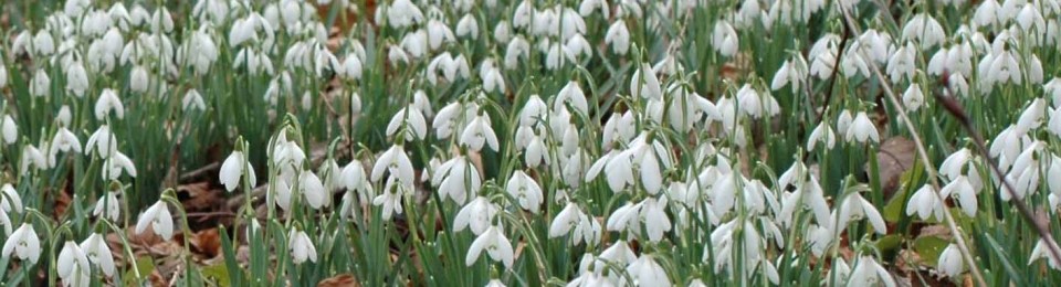 Habitat: On the European continent Snowdrops grow in wild habitats, in damp woods and meadows up to 1,600 metres; the leaf tips are specially hardened for breaking through frozen ground. In Britain, Snowdrops are possibly both native and naturalised and were not recorded as growing wild here until the 1770s. It is very likely that many of our colonies of wild Snowdrops originated with ecclesiastical plantings. The pure white blooms of the Snowdrop have long been accepted by the Catholic Church as a symbol of Candlemas, celebrated on February 2nd, the Feast of the Purification of the Virgin Mary, and their association with monastic sites is apparent right across Britain.