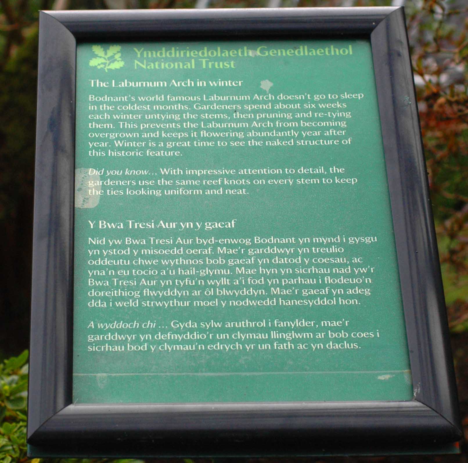 As I mentioned earlier, Bodnant is famed for its beautiful and impressive laburnum arch. At this time every year the arch is painstakingly pruned and the branches that will produce this year’s blossoms are individually tied into place. On the day of our visit we spoke to the ladies doing the work, which they assured us is a real labour of love and that its repetitive nature is peaceful and ‘zen-like’. Good to hear as the process takes around six weeks to complete. For visitors the end result is a neat and orderly, beautifully crafted structure that will support thousands of panicles of glorious yellow flowers this coming spring.