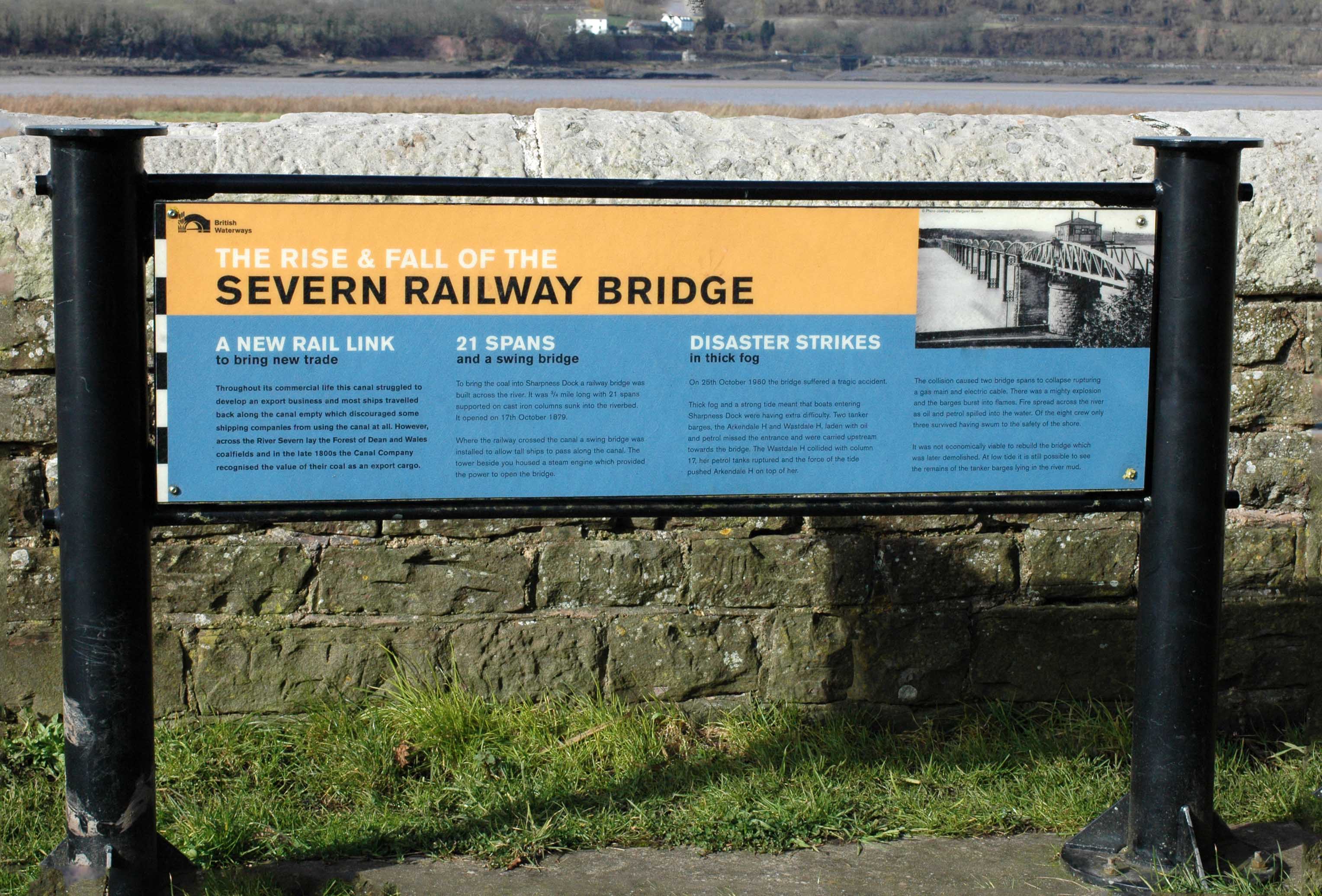 Reaching the stone structures on either side of the canal, a narrative board explains the disaster that caused the destruction of the railway bridge, built to span the river and transport coal from the Welsh mines to Sharpness dock. It had been opened on 18th October 1879 and the incident that destroyed it occurred on 25th October 1960, almost 81 years to the day later. Two tanker barges and five men were lost in the tragedy, which is referred to as The Severn Bridge Disaster