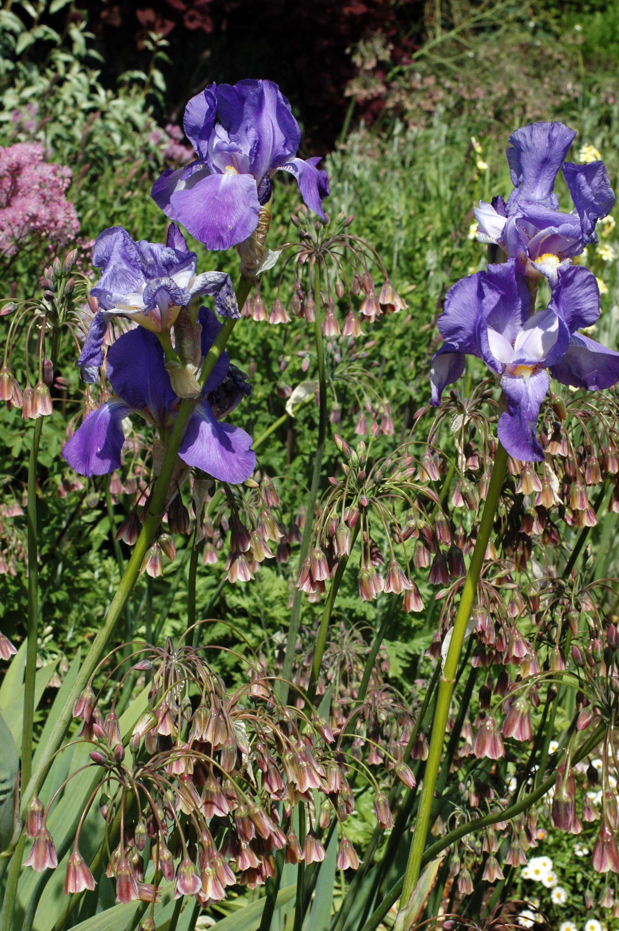 I loved the colour and form combination of the blue flag irises and unusual ornamental onion plants that had umbrellas of hanging, bell-shaped flowers. A nearby plant label named them as Nectaroscordum siculum and I think they may commonly known as Sicilian honey garlic.