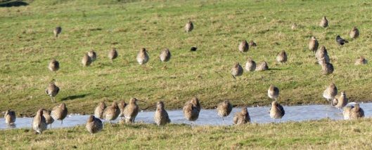 I always stop here and look over the wire fence that marks the boundary of the private woodland and a small field. Trees on its edge although leafless are greened with ivy and gorse, which may well have once been planted as a hedge to contain livestock, has some golden blossom.