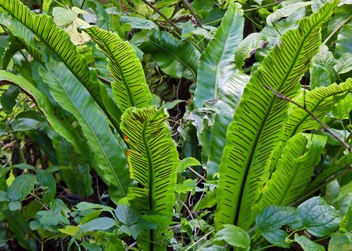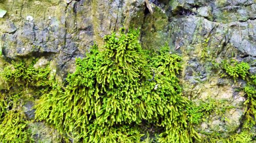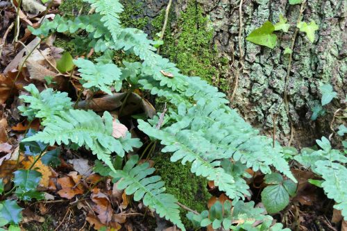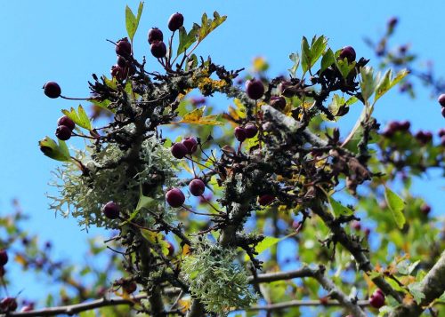 There’s green at ground level too; Polypody and Hart’s Toungue ferns are both evergreen. There are bright green patches of mosses and grey-green lichen is dusted in varying amounts onto most tree trunks and branches.