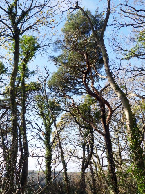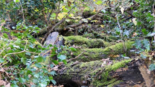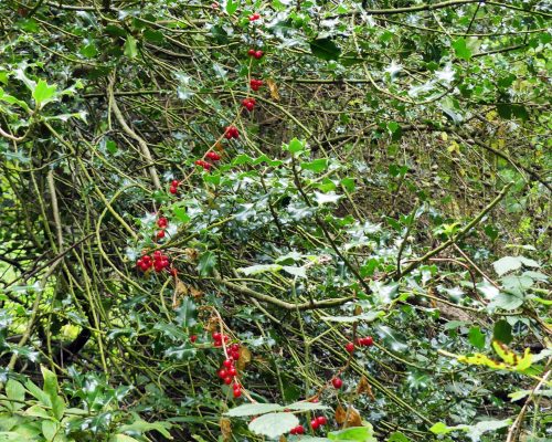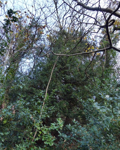 The amount of permanent greenery always takes me by surprise. Much is in the varying forms of native trees and shrubs; dark dense Yew that fills spaces from the ground upwards, Scot’s Pines with tall trunks and bristly green crowns, glossy spiky Holly, some sprinkled with shiny green berries and of course Ivy, masses of it. There are other non-native residents too, sprawling Laurel being the most evident.