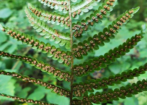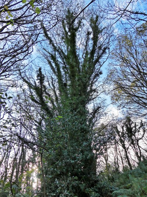 Ivy completely covers a tall tree, Holly in front and a still-green Male fern on the ground