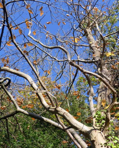 Without the dressing of leaves the architecture of individual trees is revealed. I must have passed this tree dozens of times as I’ve walked this path but today it caught my attention as the sunlight turned its remaining dried out leaves to coppery gold.