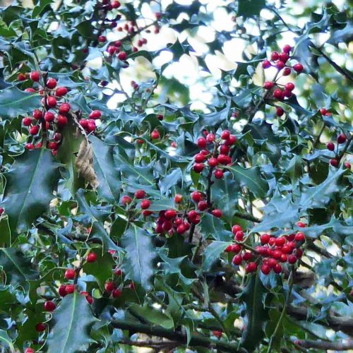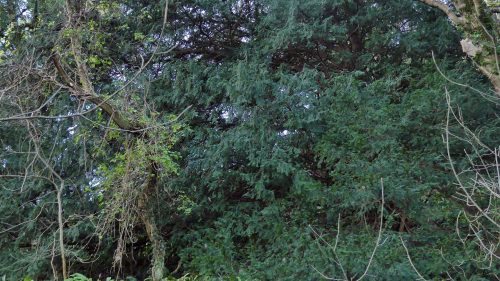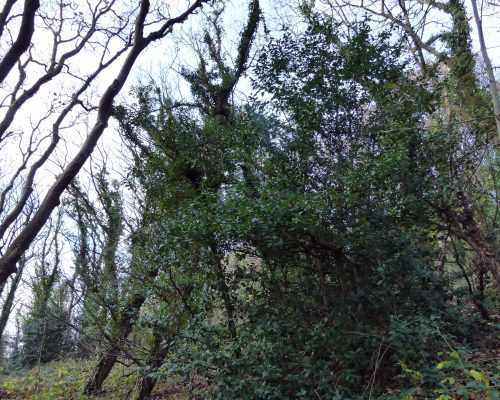 Ivy is creeping up the trunk of the tree and it has a backdrop of dense dark green Yew and shiny Holly.