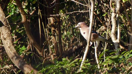 If you’re looking out for birds, staying still in a likely spot is often more rewarding than any amount of walking and the next few moments bore this out. This part of the wood is favoured by Jays and I heard some screeching to to one another close by. At first I couldn’t locate them, but then saw one progress its way down from a tree to some low vegetation then onto the ground where it began searching for its stash of buried acorns. The green plant in the picture is newly-sprung Dog Mercury.
