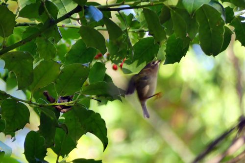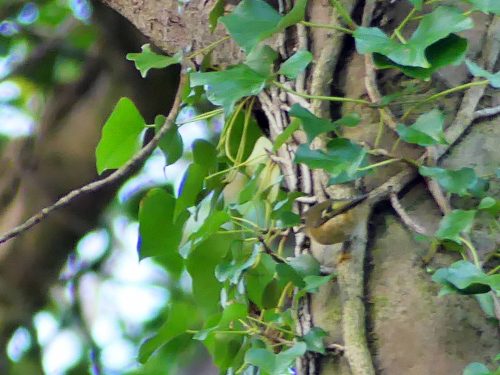 I watched it for what seemed like ages trying to keep it in sight as it flitted from branch-to-trunk-to-branch, in and out of the ivy, now doing its hummingbird impression – and then demonstrating a behaviour I’d read about but never seen; it climbed up the thick ivy stems like a tiny treecreeper. What brilliant little birds they are. I wish I’d had better light for better photographs.