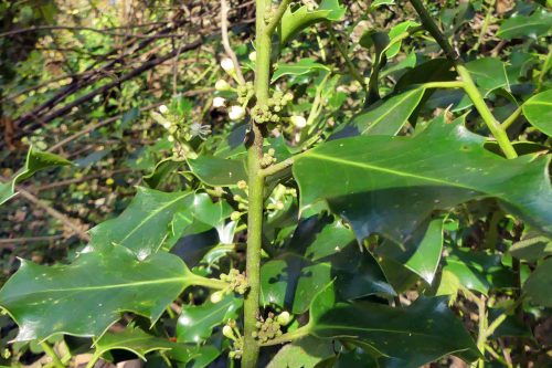 Ivy is a much-maligned native evergreen that was thought to strangle trees as well as spoil their appearance. In the days when this woodland would have been strictly managed it would probably have been regularly stripped away. Now left to its own devices it is without doubt the most dominant of the native evergreens here; scrambling to the tops of even the tallest of trees in its search for light and covering large areas of the understorey too. The benefits of ivy to wildlife are enormous; both its pollen and berries can be an essential source of food for many insects and birds and it provides shelter for invertebrates, birds, small mammals and bats. At this time of year it also gives cover to foraging parties of small birds such as tits and treecreepers whilst they search amongst its stems and leaves for hibernating insects and spiders.