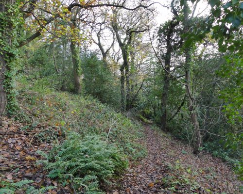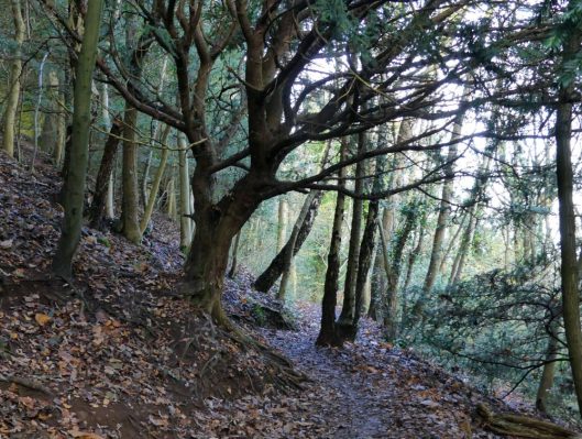 Past the bench the path continues through what I think of as ‘the Dark Wood’. Here the hillside rises steeply upwards on one side and almost as steeply downwards on the other. On the north/north-west side of the Bryn not much sunlight reaches here and there’s a density of Yew trees that also make it seem darker.