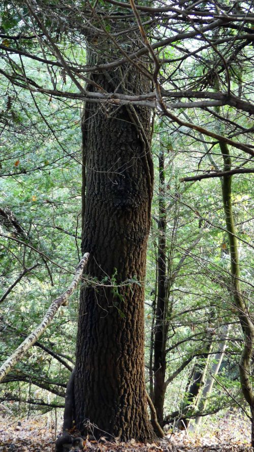 From the lower downward slope a mighty tree trunk rises, by far the biggest tree here and that I’ve always assumed was a mighty pine, a Redwood or Sequoia or such-like.
