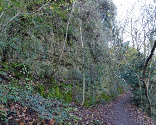 On the opposite side of the path a sheer cliff of exposed limestone towers and adds to the atmosphere. I wonder if it was once part of the defences of the ancient hill-fort that was located on the summit.