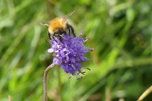 12:37 It was windy up here, which is by no means unusual, but there were butterflies and bees flying about, all keeping low and in the shelter of the vegetation. There were Ringlets, the first ones I’ve seen so far this year, some were chasing around not settling at all, but there was one that found a sunny spot on a low bramble leaf that it kept returning to. I couldn’t get a better angle for a photograph, but I was happy to get one at all.