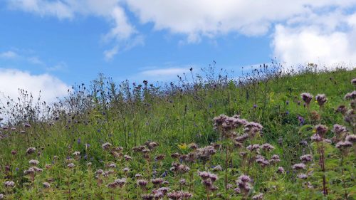 The summit, which as you see from a distance, is gently rounded and surprisingly grassy and well-vegetated. There is a huge raspberry-bramble patch, which is always slightly later to flower than those plants lower down the hill, which was attracting the attentions of a Red Admiral and another Small Tortoiseshell butterfly.