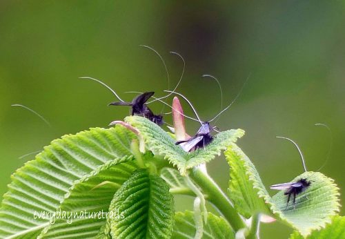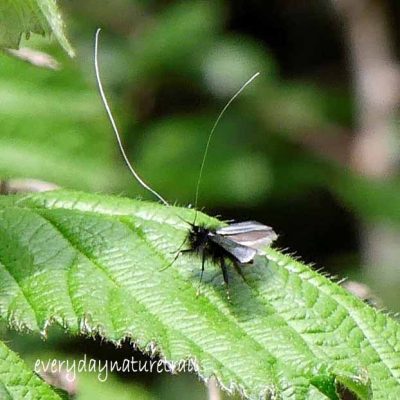 On a Dog-rose briar were several shiny new 7-spot ladybirds and a Rose Sawfly. Adults of this species are distinctively coloured black and gold and have smoky wings. Female sawflies lay eggs in soft young rose stems and the emerged larvae are sometimes considered to be ‘pests’ in gardens as they feed on the soft tissue of rose leaves, leaving just the leaf ribs. Happily they’re safe from human interference here, although doubtless there’ll be predators awaiting future larvae.