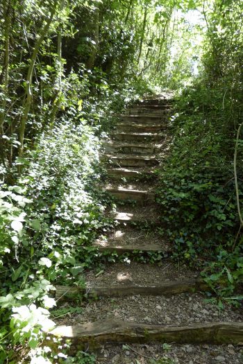 12:05 The steps lead up from the Woodland Trail and into an open sloping grassy space, whose character changes from year to year, largely according to the weather. The soil covering over limestone rock is very shallow and susceptible to erosion by the elements and by people walking over it; consequently it dries out rapidly when it’s as hot and dry as it was throughout this May. The grass is cut every year, sometime during the autumn or late winter and by now it would usually have grown quite tall again at the bottom end of the slope, but this year it is struggling to recover. A few days before I took this photograph, before the rain returned, it was completely brown and dry. There’s still time for it to pick up though, particularly if it keeps raining: plants that grow here are tough.