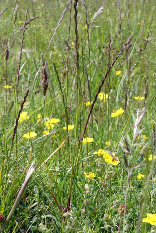 Briwydd felen, common milkwort, dark green fritillary, eyebright, Galium verum, Great Pied hoverfly, Lady's bedstraw, meadow wildflowers, Sicus ferrugineus, strangalia maculata, sulphur beetle, thick-headed flies, wild thyme