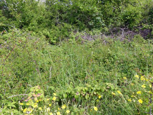Keeled garlic, whose flowers attract Common Blue butterflies and the long stand of Hemp Agrimony on the woodland edge are in bud.