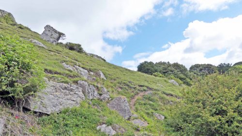 I’m sure this upward slope gets steeper each time I climb it! I have to remind myself it wasn’t built for walking up. Back in the days when quarrying was in full swing there were rails from its bottom end up to what was a quarry face; trucks were loaded with stone then lowered down and returned empty using heavy-duty winding gear – the remains of which still stands as a monument to past industry at the top of the track. Care is needed when using this track, it’s slippery when wet and dry, especially going down.