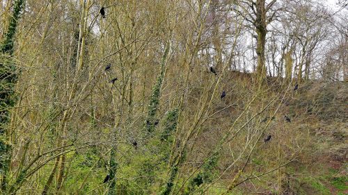 From the clearing the leaf-strewn trail is sloping and for a while the woodland has a different feel to it. It’s more open, there are noticeably less large trees and more undergrowth and ivy.