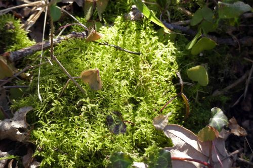 From a coppery sea of dry leaves rose a small bright green island of moss. Close up this particular moss always makes me think of miniature pine trees. Moss identification is not a strong point of mine, but I think this is a Haircap species.