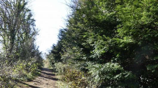 The path begins to slope down; the ground falls steeply away on one side and is lined by a ferny bank on the other. I stopped here for a few minutes to watch a foraging party of Blue Tits, Great Tits and Long-tailed Tits, a few of the latter had come down into the Holly tree in the photograph and stayed within in it for a good few minutes. Other than Wood Pigeons, these were the only birds I saw while I was here.