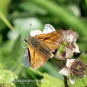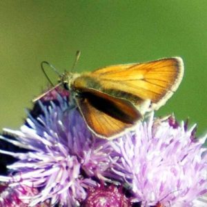 This family were named ‘skippers’ due to their quick, bouncing flight, which is quite different to that of other butterflies. They are small with chunky bodies, giving them a moth-like appearance. Their antennae are widely separated at the base and strongly curved or hooked at the tip. Five of our eight British species have golden-orange uppersides and are called ‘golden skippers’: these all bask with their forewings partly raised and the males have conspicuous lines or patches of scent-emitting scales.