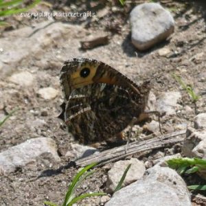 Behaviour: As they land Graylings usually display most of the underside of the orange-coloured upper forewing, gradually closing it until just one ‘eye’ is exposed before finally closing it completely. This behaviour is also seen in other butterfly species that have eye-like markings, and it is thought that this offers a target to a potentially lurking predator, which may strike there rather than at the actual head. The butterfly may survive losing a chunk of wing, but not its vital body parts.