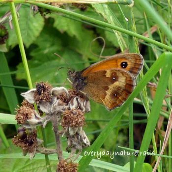 Behaviour: Gatekeepers feed at flowers, Ragwort, Knapweed and Hemp Agrimony all attract them. They are commonly found around bramble thickets too, where the male displays striking territorial behaviour. He perches on a shrub or tall plant and challenges any other butterfly or even insect that comes within its range.
