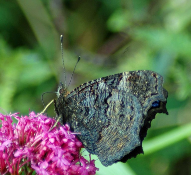 Underside of Peacock butterfly on red valerian, Bryn Pydew, North Wales