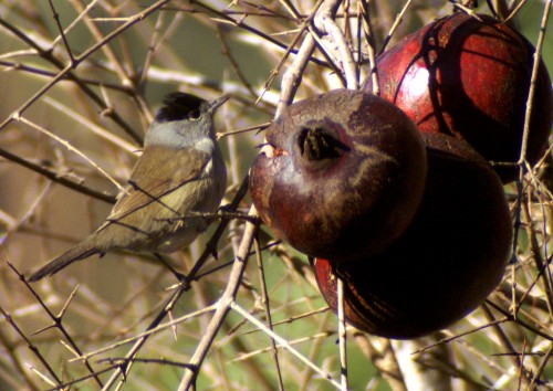 The blackcaps wait for the pomegranate fruit to ripen and split then gorge themselves on the fleshy seeds until all that remains is the husk. Sotogrande, Spain