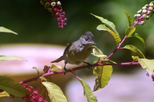 Caps of young birds begin brown as those of the female, males gradually turn black. Plant is American poke-weed, blackcaps love feasting on its ripe berries. Sotogrande, Spain.