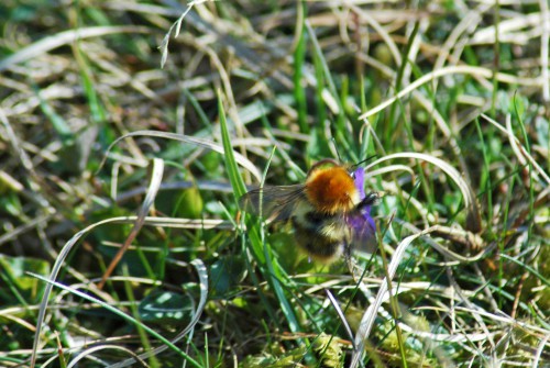 One or two Buff-tailed bumblebee queens flew in low over the vegetation, zooming then off up into the woods; perhaps they were still seeking a good spot to nest, or maybe carrying pollen to stock up one already made. Another emerged briefly, then crawled back under leaf litter and disappeared from view. A Common Carder Bee queen emerged briefly from beneath dry leaves but quickly crawled back and I had a similarly brief view of a Tree Bumblebee. It will be interesting later on to see if there are signs that all, or any of them have made nests here