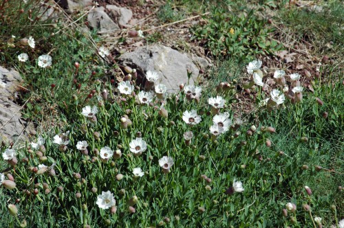 Although grazed by sheep and rabbits and exposed to the worst of the elements here, wildflowers can be found tucked down in the turf particularly around exposed rock. I spotted this little patch of white flowers, which on closer inspection turned out to be two different species. I couldn’t name either, but very kindly Suzanne posted a comment and suggested the tiny one with red-tinged fleshy leaves may be Rue-leaved saxifrage and the bigger more droopy one with fine stems as Common Whitlow grass. I will go back and get some better photographs of the little treasures.