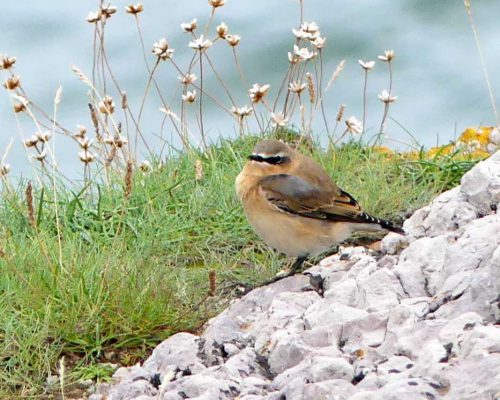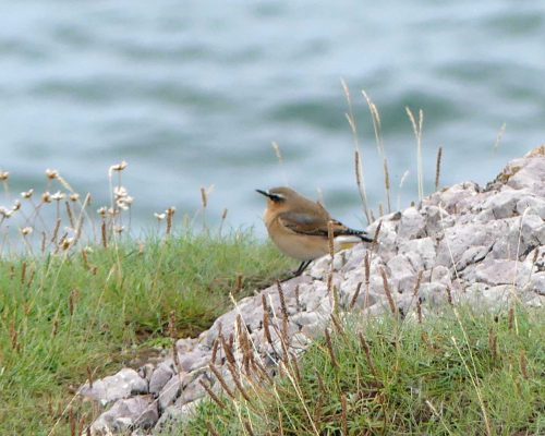 There were no signs of either Cormorants or Guillemots on this side of the cliff so I carried on walking towards its other more easily visible side. I hadn’t gone far when I spotted a bird flitting about between rocks near the edge; a handsome male Northern Wheatear. It was slightly below me behind a bit of a ridge, so partly hidden from its view I managed to watch it for some time with out disturbing it.