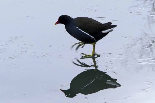 A Moorhen had been foraging on the far bank then dropped back onto the water, paddled across and left it again to patrol along the pipeline that runs the length of the river, where it is exposed to differing degrees. In this shaded spot below an overhanging bramble the water below was icy.