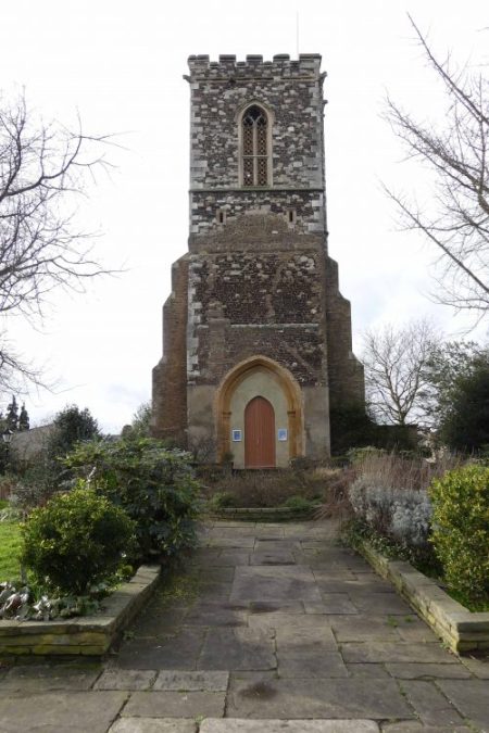 Near the top of Hornsey High Street there are intriguing glimpses of a stone tower seen from the pavement through a screen of tall trees. This is all that remains of St. Mary’s Church, the Parish church of Hornsey.