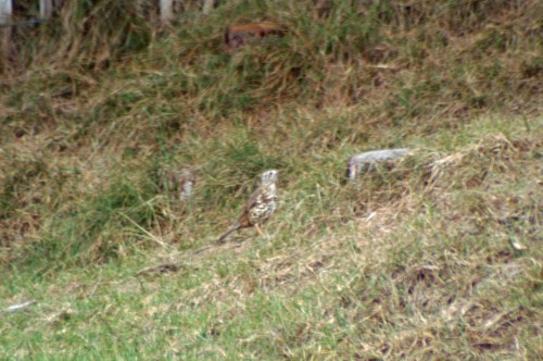 After a few minutes I realised that the thrush had no plans to move far, which led me to think that it may well be nesting somewhere nearby. Mistle Thrushes are early nesters, so this could have been the male of a pair keeping watch over his nest and territory. The bird moved further back again, towards what I think of as the Pine Grove, where a dozen or so tall, wind-contorted Scots Pines are gathered at the edge of this patch of woodland where it meets an open field. Perfect Mistle Thrush nesting territory.