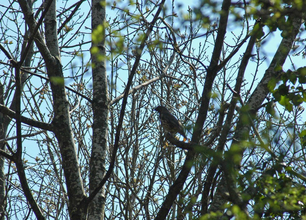 Meanwhile, the Mistle Thrush had flown up to a tree branch and sat in full and open view with his chest feathers puffed out, making him look a completely different shape and much bigger; from a distance he looked a bit like a female Sparrowhawk. He was still fully alert though and quickly dashed out when a kafuffle broke out around a neighbouring tree. A Magpie had flown in and perhaps deliberately, must have got close to the nest. I assume the female had been sitting on it and launched herself at the Magpie, which was screeching loudly. Both Mistle Thrushes went on the attack, also calling loudly and saw the Magpie off. Peace resumed and the male went back to his perch, re-fluffed his feathers and sat quietly once more.