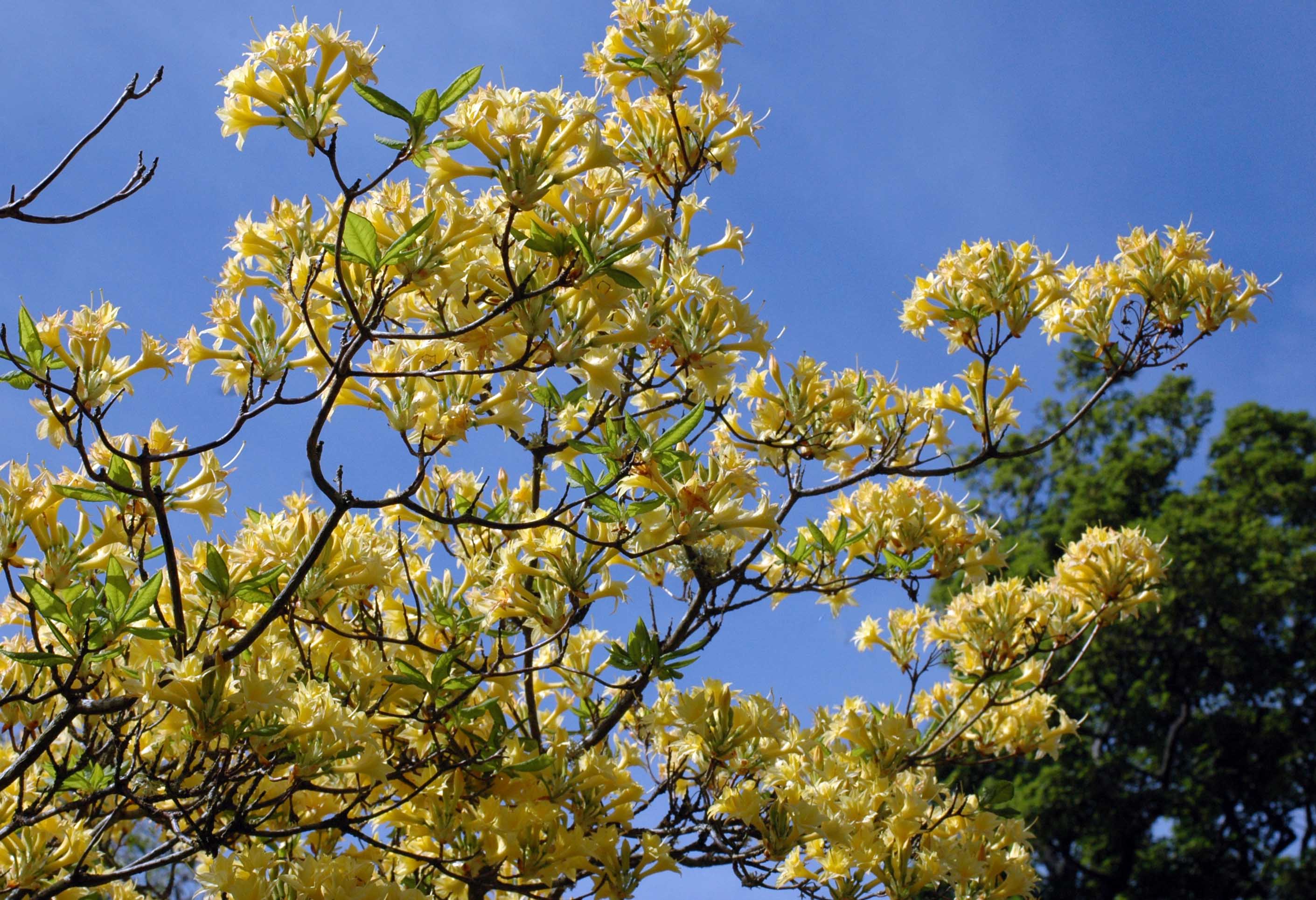 and beneath the tree beautiful blue Meconopsis, or Himalayan Poppy