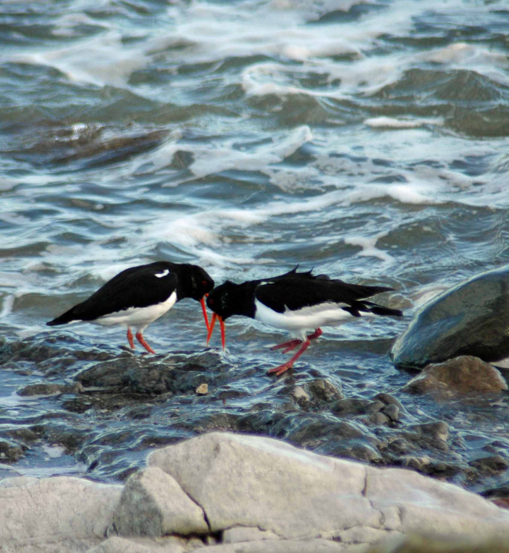 There were foraging birds on the shore now, jackdaws were probing the pebbles, and a redshank and an oystercatcher were inspecting the muddy sand. A herring gull was watching the oystercatcher intently, whilst stalking towards it.