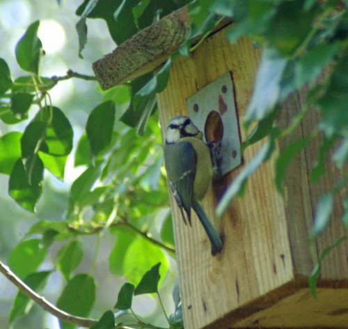 I moved from one side of the tree to the other to try to get a better view of the nuthatch, and as I did so a blue tit flew down to the nest box fastened to the same tree much lower down. Deciding I was just a nuisance rather than a threat, it went in, rummaged around a bit, threw out some rubbish then left to be replaced by its partner. So now I know the location of two nests to keep an eye on.
