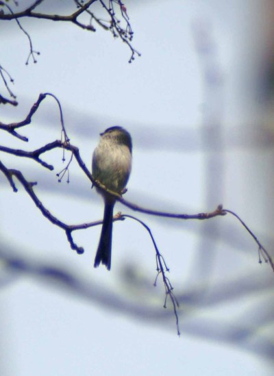 There were birds singing all around me, but none that I could really see properly until I just caught a glimpse of movement and a flash of black and white from a tangle of shrubbery. It was not till a bird emerged and flew up into a tree that I realised it had been the tail end of a long-tailed tit that I had seen. There were at least two flitting about, but this was the best view I had; a very brief one, and the photograph was almost good – it really shows the length of the tail shame it was looking away from me.