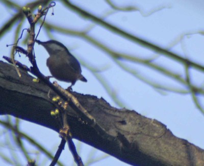 As always I was thrilled to catch sight of the delightful little birds and to add another species to my list of birds seen in this small local nature reserve. Whilst watching the long-tailed tits I was half aware of another bird calling; it was a call I recognised but could not place until I traced it back to a bird quite high in a tree almost next to me – a nuthatch.