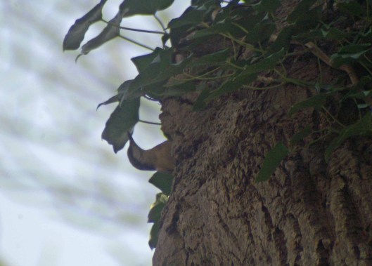 I was even happier now, with two new species for my list and things just got better; there were two nuthatch there and it quickly became apparent that they were in the process of working on a nest hole. This was located on a kind of ‘elbow’ of a branch high up on a very tall tree, a sycamore I think, and well covered with ivy. Both birds were working away in turn and occasionally small pellets of material fell to the path beneath them.
