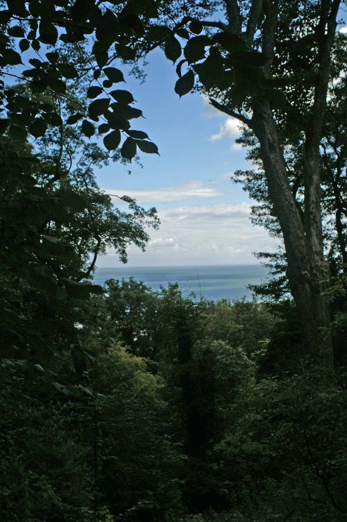 You are on high ground here and through the trees there is a view over the edge of Colwyn Bay town and out over the Bay itself to the wind turbines.