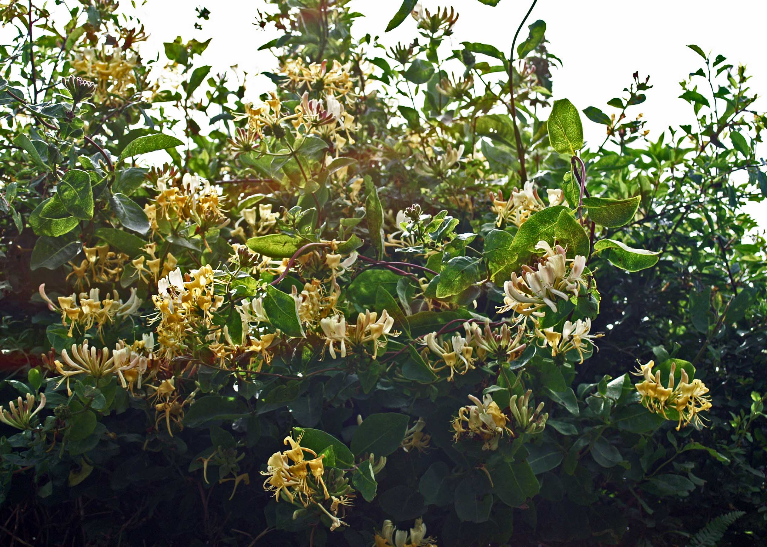Honeysuckle lit by evening sun in a hedgerow, Nevern, Pembrokeshire